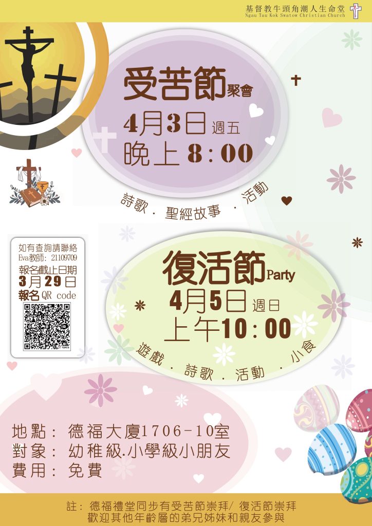 註:德福大廈1706-09室禮堂同步有受苦節崇拜/ 復活節崇拜,歡迎其他年齡層的弟兄姊妹和親友可以參與。